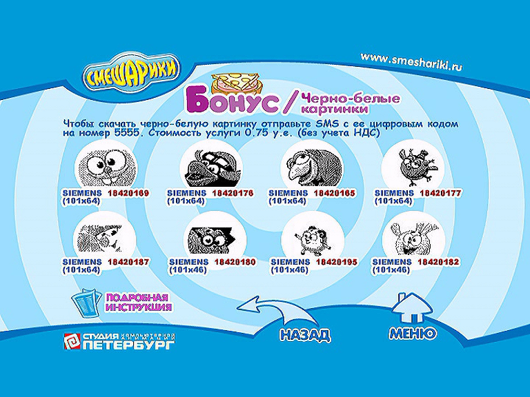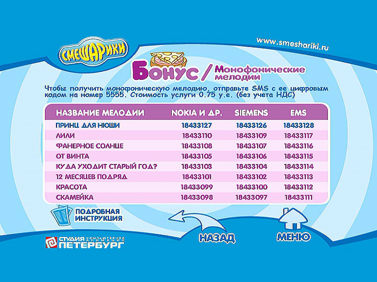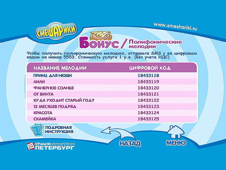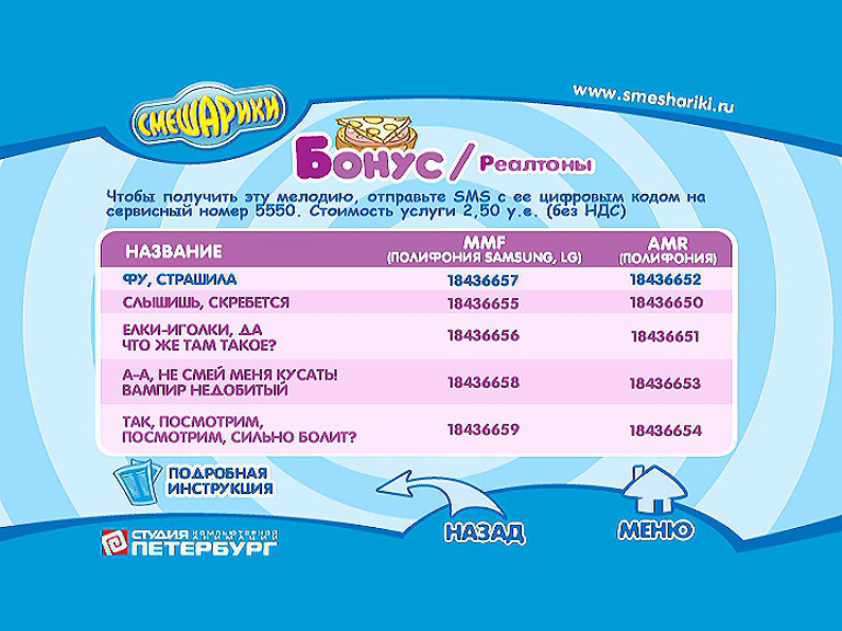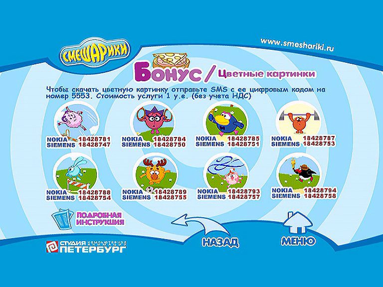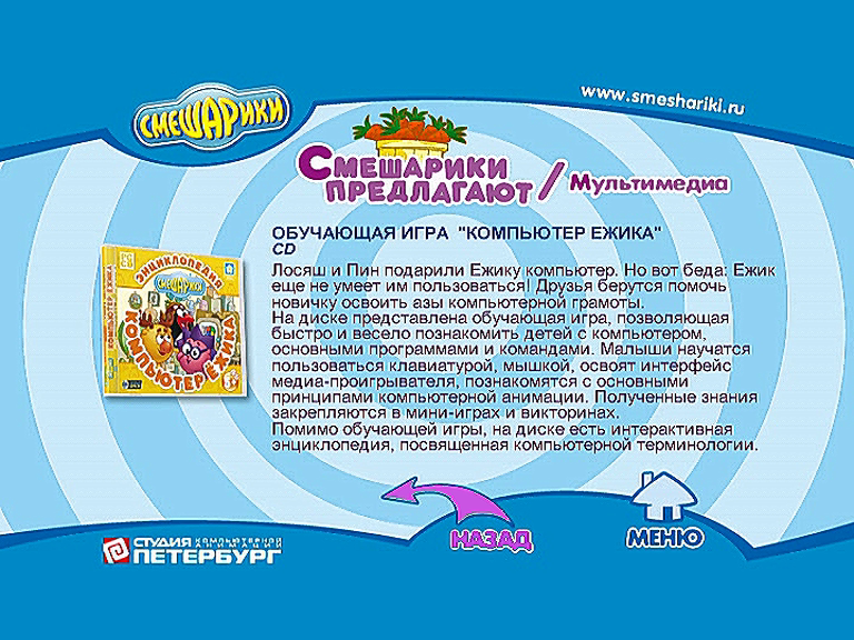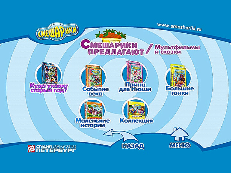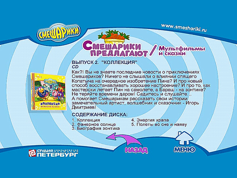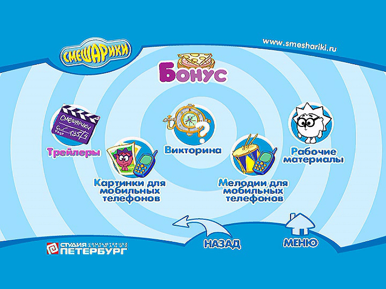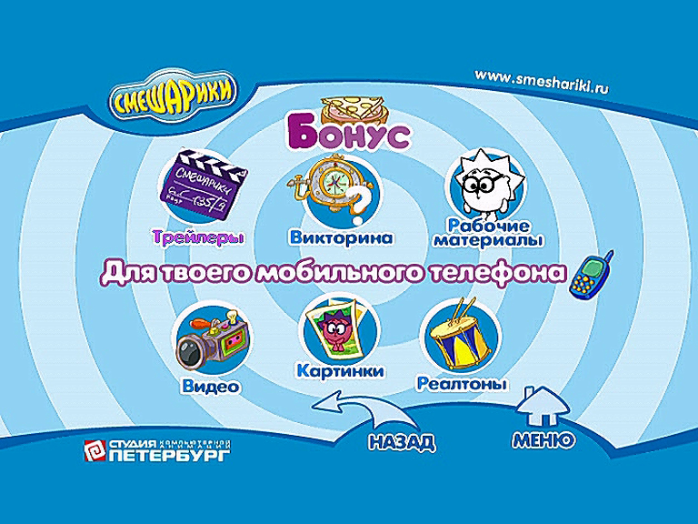 Бонус: Весёлая игра-викторина Рабочие материалы новой серии ("Маленькое большое море") Трейлеры серий из других выпусков ("Некультурный", "Лили", "Тайное общество") Каталог продукции Смешариков